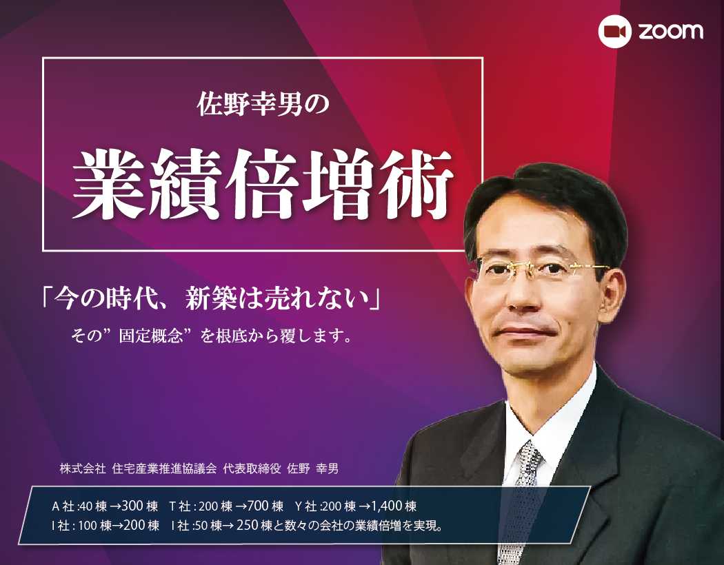 また、大手ビルダーのAホームの副社長を務め、年間棟数を205棟から878棟に引き上げ、粗利率も大幅改善し黒字化に寄与する。その後様々な住宅会社の顧問を務め、その経験値を中小規模の住宅会社にも転換。営業プレイヤーだけではなく管理職や組織に目を向けた様々なアプローチで企業で業績倍増を成し得たノウハウを今回のセミナーに集約。